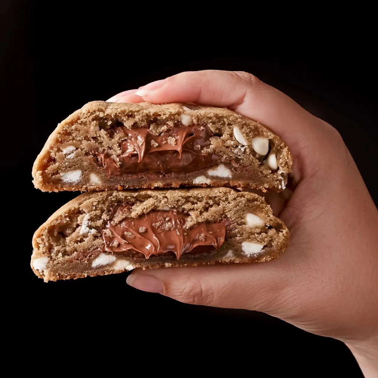 Cookie com massa tradicional, com gotas e pedaços de chocolate branco, e recheio de nutella.